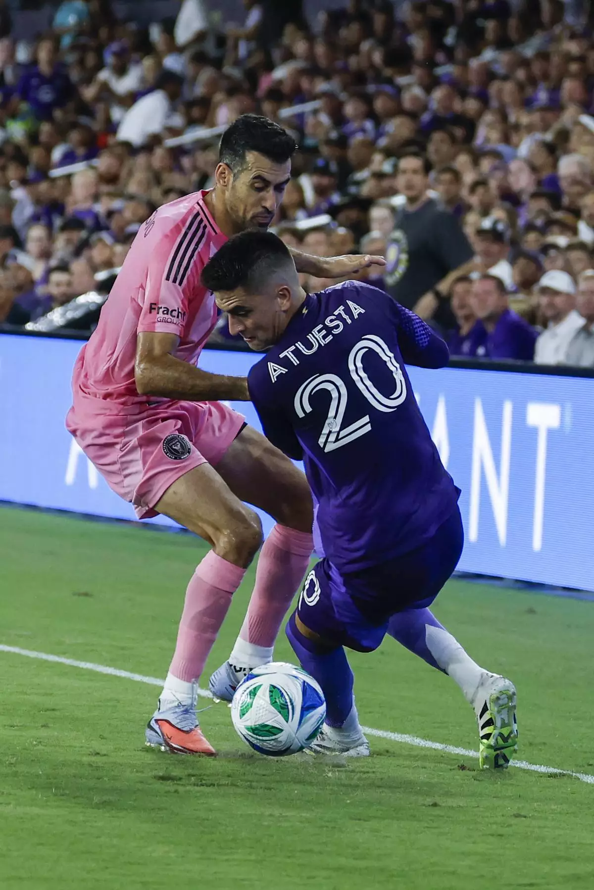 Orlando City midfielder Eduard Atuesta (20) and Inter Miami midfielder Sergio Busquets fight over the ball during the first half of an MLS soccer match, Sunday, Aug. 10, 2025, in Orlando, Fla. (AP Photo/Kevin Kolczynski)