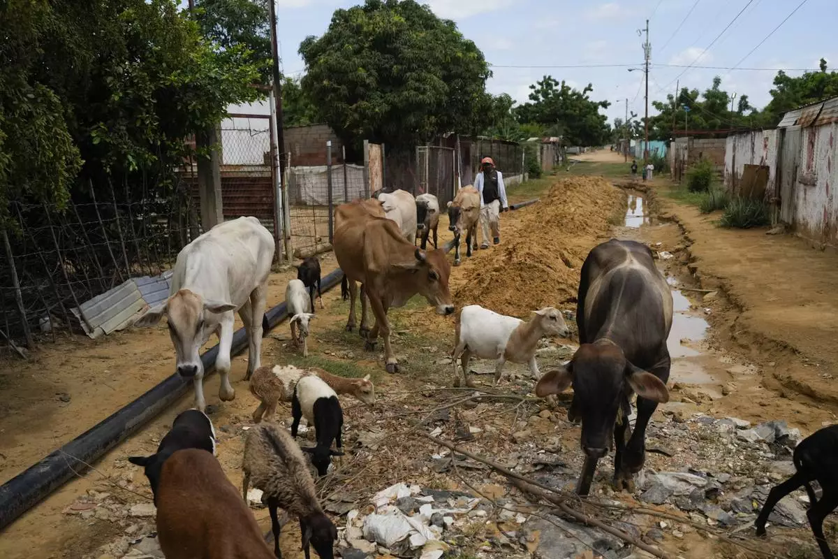A man herds cattle past the home of the Romero Perez family, who returned to Venezuela from Mexico after abandoning plans to reach the United States amid President Donald Trump's migration crackdown, in Maracaibo, Venezuela, Tuesday, June 17, 2025. (AP Photo/Matias Delacroix)