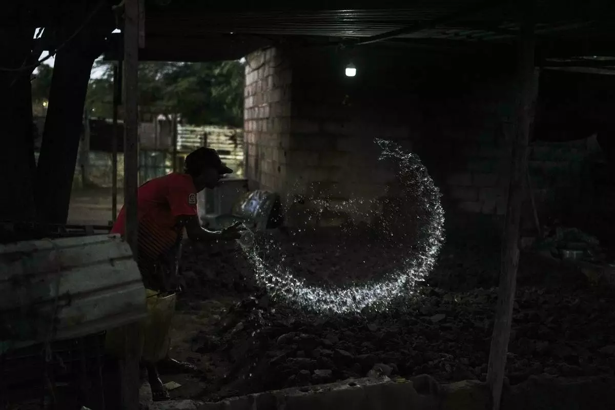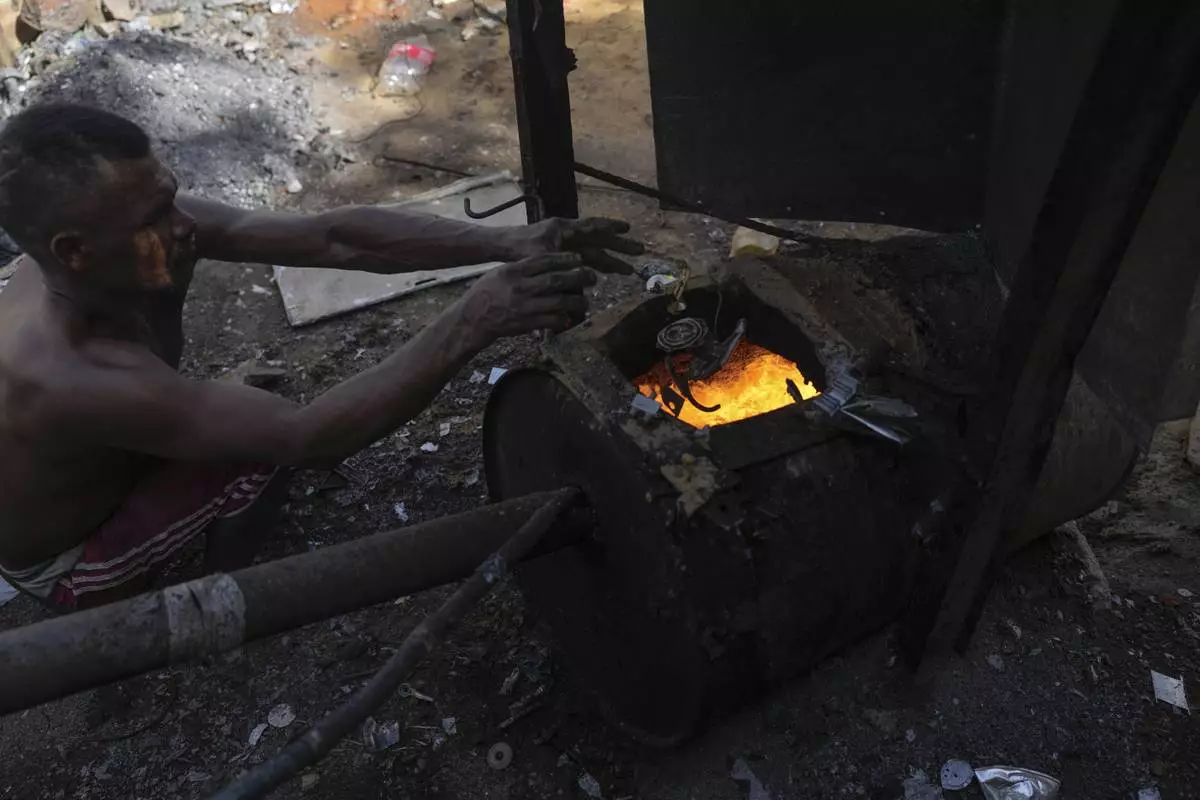 A worker hired by the Romero Perez family, who returned to Venezuela from Mexico after abandoning plans to reach the United States amid President Donald Trump's migration crackdown, melts aluminum to make pots in Maracaibo, Venezuela, Monday, June 16, 2025. (AP Photo/Matias Delacroix)