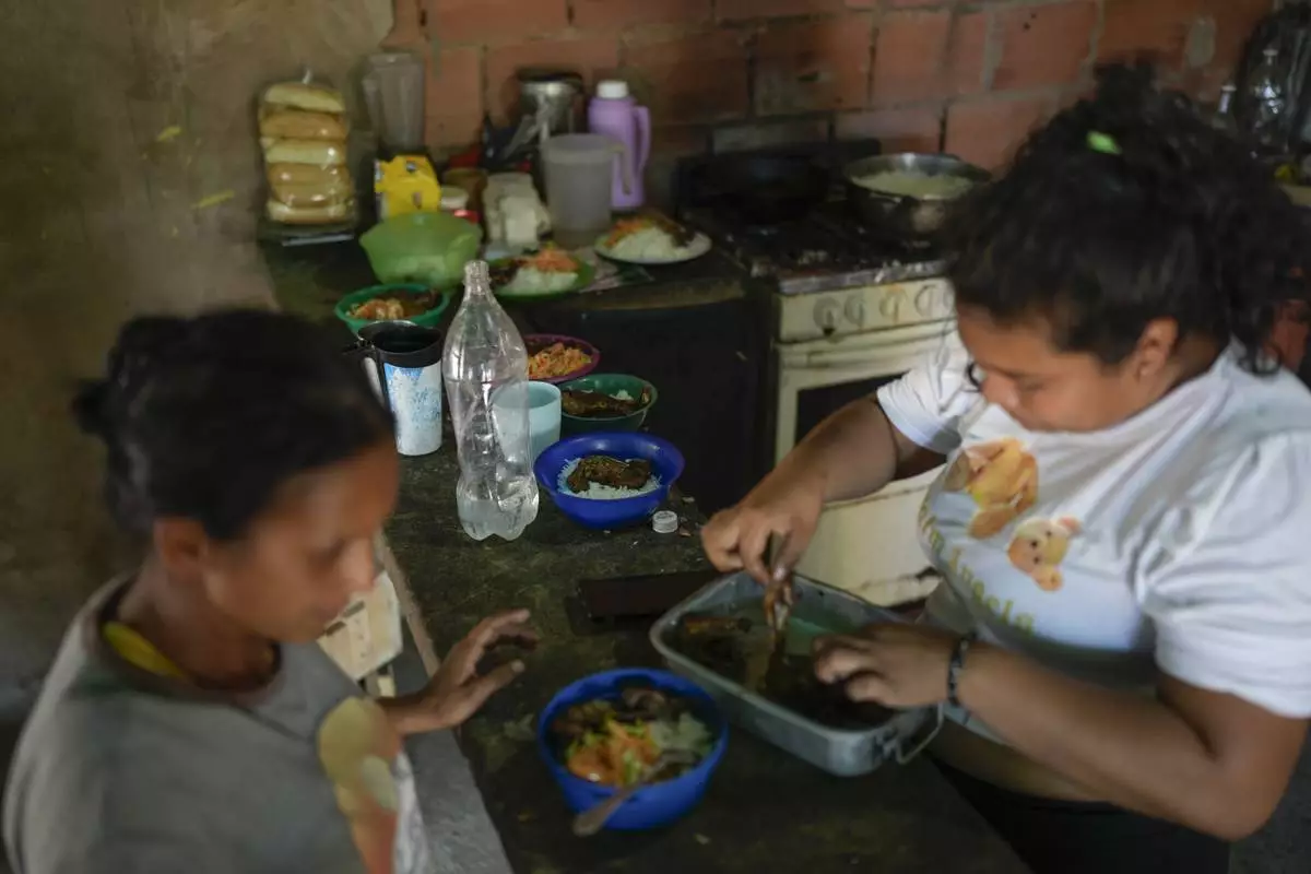 Yoselin Perez, left, who returned to Venezuela from Mexico with her husband and five children after abandoning plans to reach the United States amid President Donald Trump's migration crackdown, dishes up lunch bowls with the help of a neighbor in Maracaibo, Venezuela, Monday, June 16, 2025. (AP Photo/Matias Delacroix)