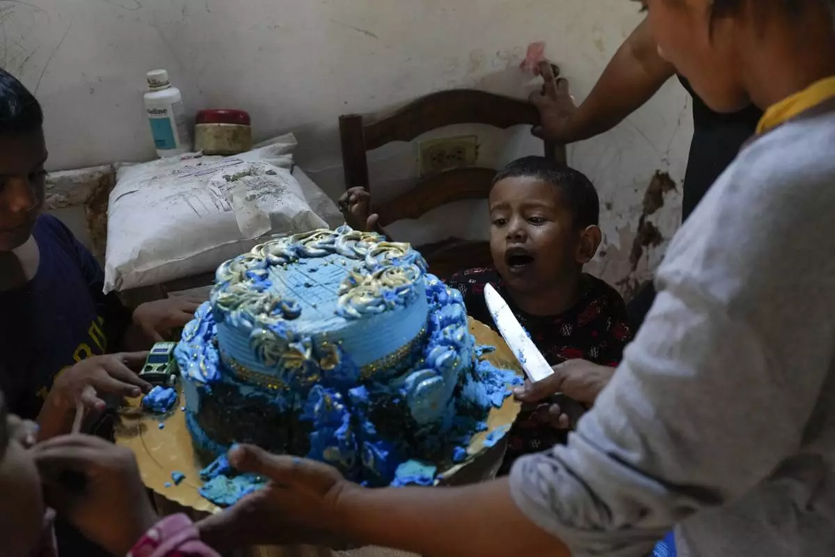Jorman Romero, one of five children who returned to Venezuela from Mexico with their parents after abandoning plans to reach the United States amid President Donald Trump's migration crackdown, asks his mother Yosbelin Perez for a piece of cake, in Maracaibo, Venezuela, Monday, June 16, 2025.(AP Photo/Matias Delacroix)