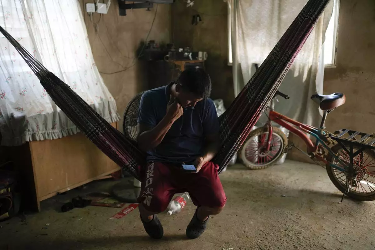 Jose Romero, who returned to Venezuela from Mexico with his wife and their five children after abandoning plans to reach the United States amid President Donald Trump's migration crackdown, looks at his phone, in Maracaibo, Venezuela, Monday, June 16, 2025. (AP Photo/Matias Delacroix)