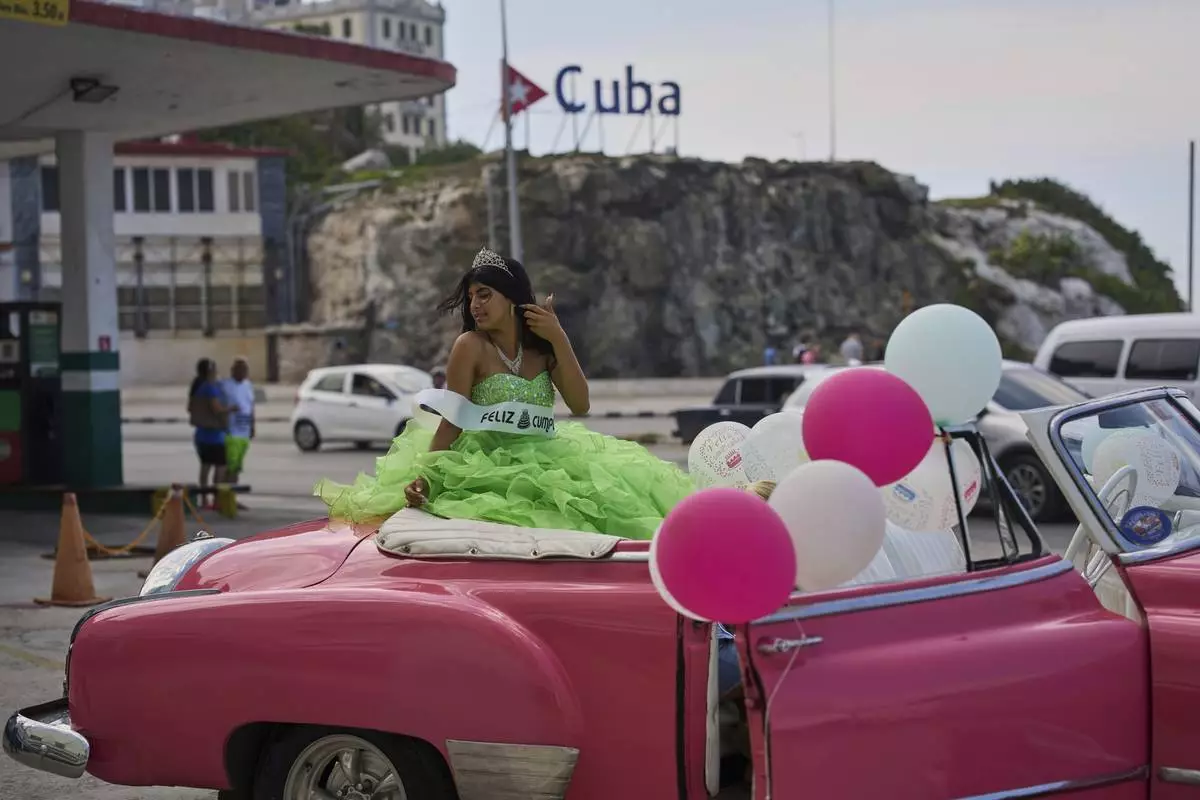 Joselin Marlen Martinez poses on top of a classic American car before her quinceanera photoshoot in Havana, Monday, Aug. 11, 2025. (AP Photo/Ramon Espinosa)