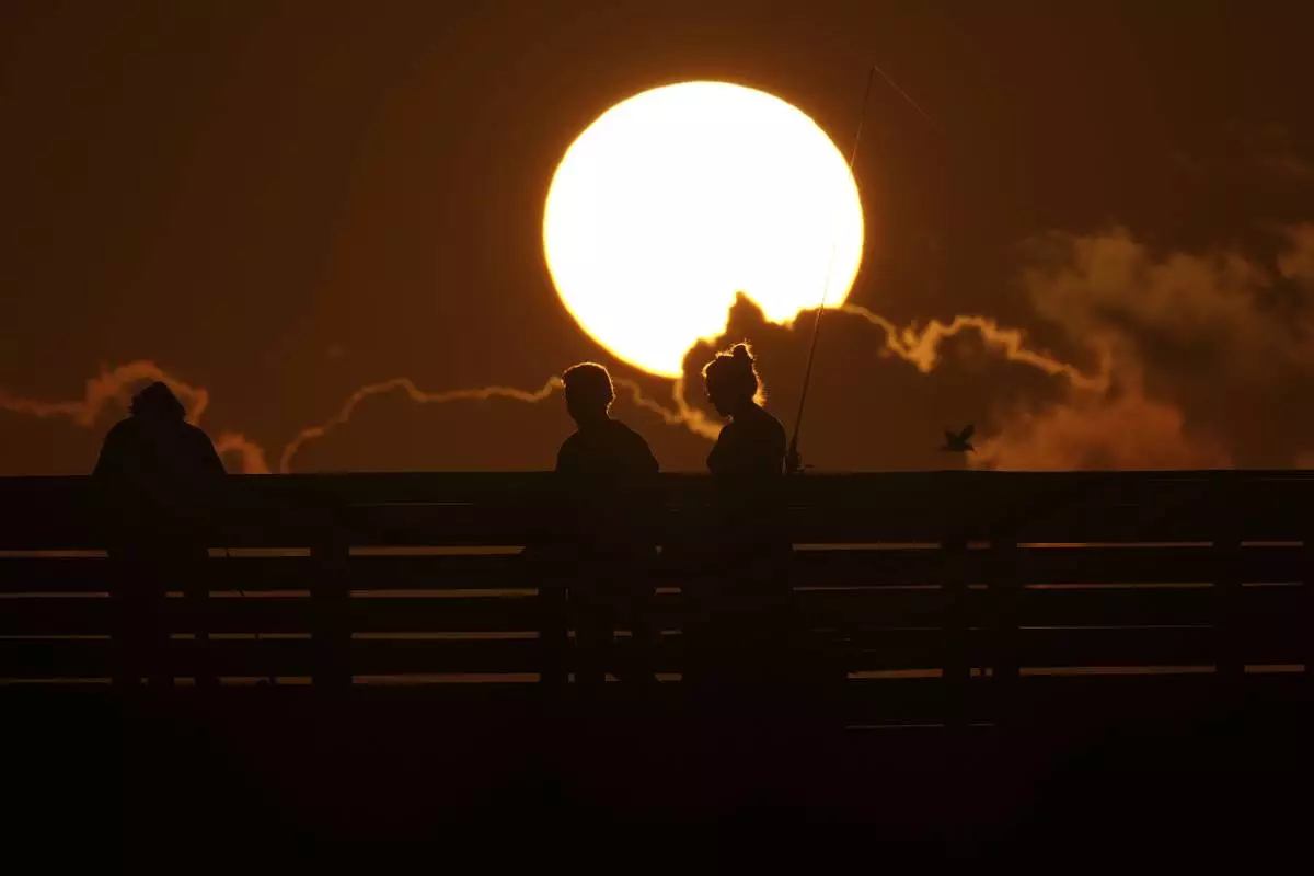 The sun rises behind a couple walking on a pier in Port Aransas, Tuesday, Aug. 12, 2025. (AP Photo/Eric Gay)
