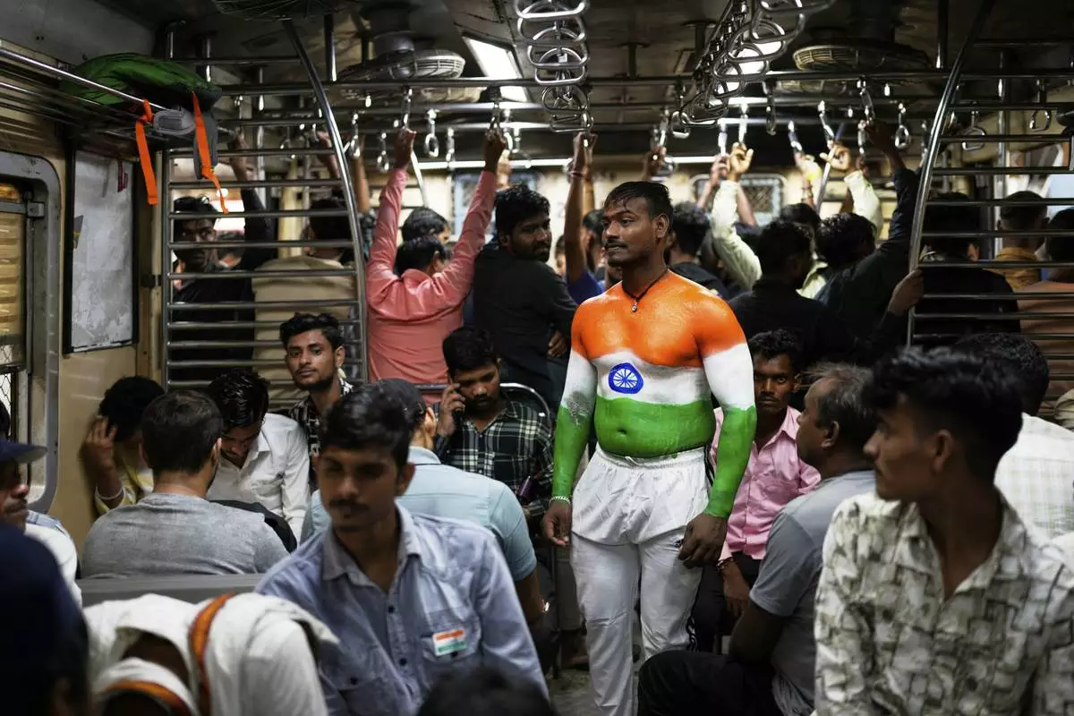 Rickshaw driver Govinda Prajapati, painted his body in colours of Indian flag, celebrates Independence day while travelling in a local train at Chhatrapati Shivaji Maharaj Terminus in Mumbai, India, Friday, Aug. 15, 2025. (AP Photo/Rajanish Kakade)