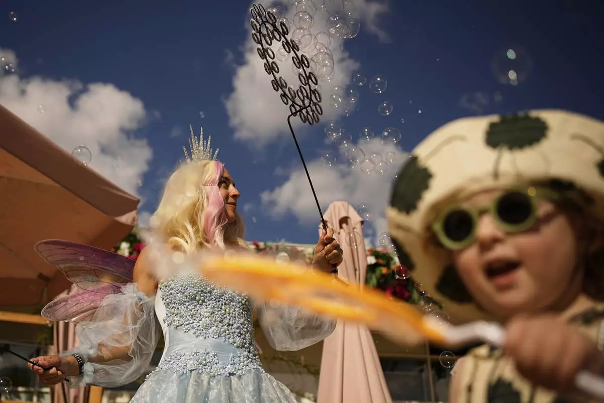 An actress blows bubbles on a beach of Pionersky pond at Gorky park in Moscow, Russia, Friday, Aug. 15, 2025. (AP Photo/Pavel Bednyakov)