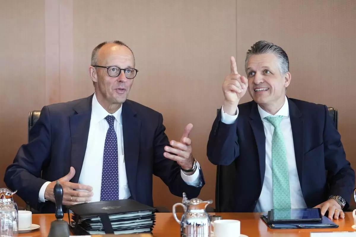 German Chancellor Friedrich Merz, left, and the head of the Chancellery Thorsten Frei talk during a cabinet meeting at the chancellery in Berlin, Germany, Wednesday, Aug. 6, 2025, (AP Photo/Ebrahim Noroozi)