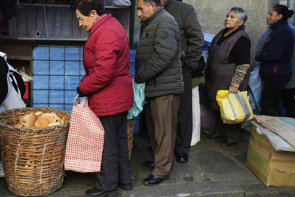 People line up to buy "pan de batalla," or battle bread, made with government subsidized flour, in La Paz, Bolivia, Saturday, Aug. 9, 2025. (AP Photo/Juan Karita)