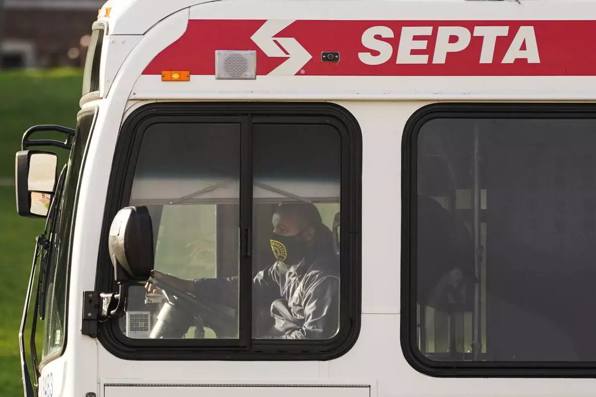 FILE - A Southeastern Pennsylvania Transportation Authority bus (SEPTA) is driven on Market Street in Philadelphia, Oct. 22, 2021. (AP Photo/Matt Rourke, File)