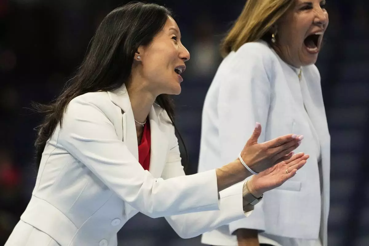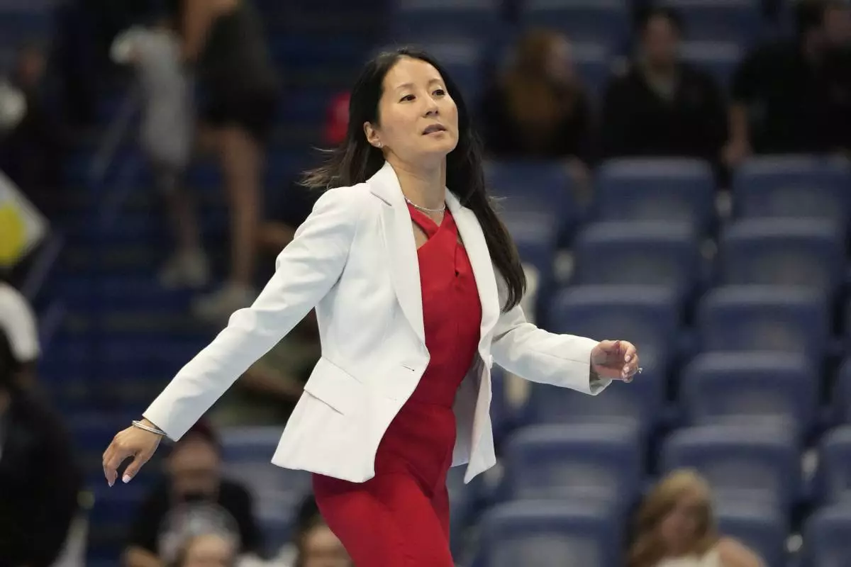 USA Gymnastics president Li Li Leung walks on stage after the senior men's finals of the U.S. Gymnastics Championships in New Orleans, Saturday, Aug. 9, 2025. (AP Photo/Gerald Herbert)