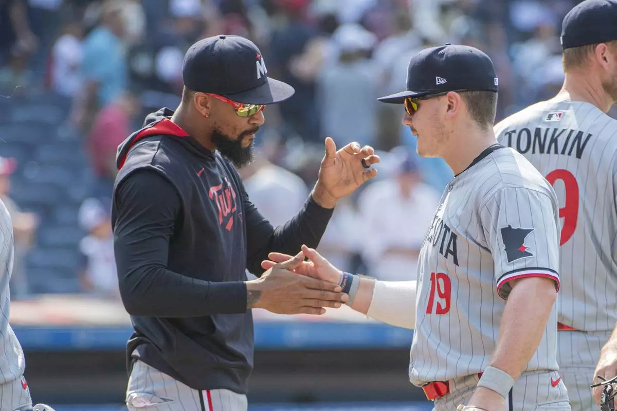Minnesota Twins' Byron Buxton, left, congratulates Alan Roden (19) at the end of a baseball game against the Cleveland Guardians, Sunday, Aug. 3, 2025, in Cleveland. (AP Photo/Phil Long)