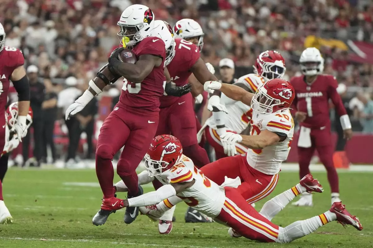 Arizona Cardinals running back Trey Benson, left, runs the ball as Kansas City Chiefs cornerback Jaylen Watson (35) pursues during the first half of an NFL preseason football game, Saturday, Aug. 9, 2025, in Glendale. (AP Photo/Rick Scuteri)
