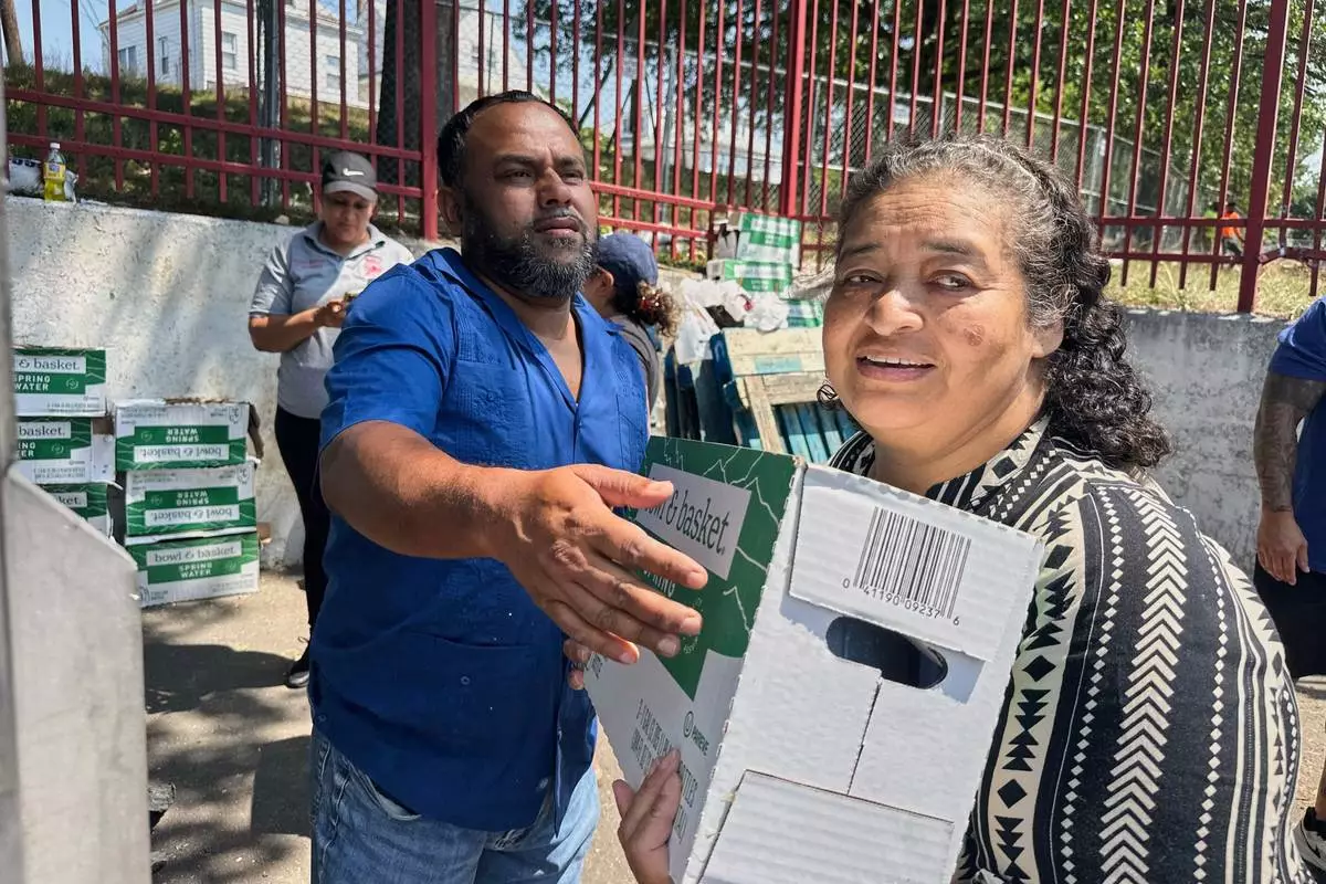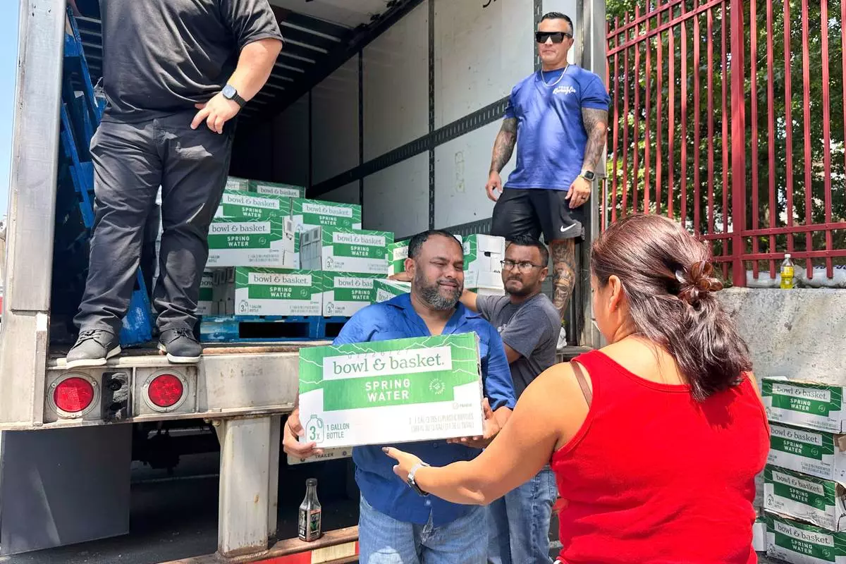 People, who were affected by a water main break that that led to reduced service to nearly 200,000 homes and businesses, pick up cases of bottled water at John F. Kennedy High School in Paterson, N.J., on Aug. 11, 2025. (AP Photo/Ted Shaffrey)