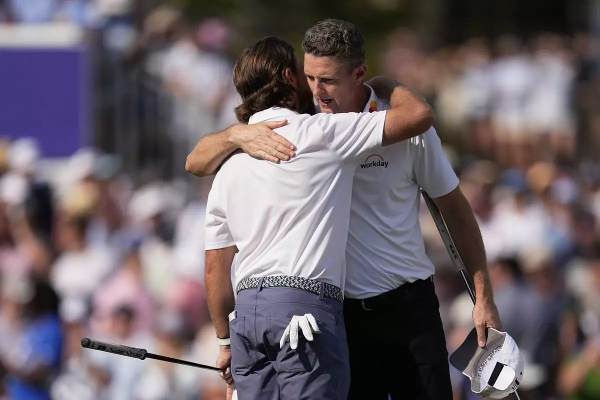 Tommy Fleetwood, left, of England, talks with Justin Rose, of England, on the 18th green during the final round of the St. Jude Championship golf tournament Sunday, Aug. 10, 2025, in Memphis, Tenn. (AP Photo/George Walker IV)