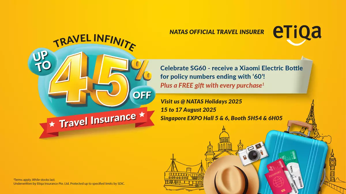 In a special nod to Singapore's 60th birthday, Etiqa is rolling out a commemorative SG60 promotion at the NATAS Fair, ensuring Singaporeans can explore the world with confidence and peace of mind. Customers can enjoy up to 45% discount on Etiqa Travel Infinite*, and up to 10% off Annual Travel Plans. Maybank cardholders will receive an additional 5% off Annual Plans, bringing the total discount up to 15%. Additionally, a delightful surprise awaits lucky customers whose purchased policy number ends in '60' – marking Etiqa's way of celebrating Singapore's special day alongside our valued customers.