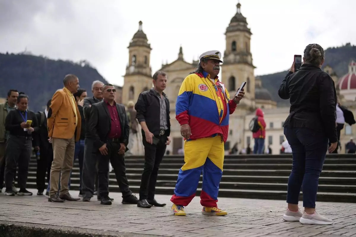 People line up outside Congress to pay their last respects to presidential hopeful and opposition Sen. Miguel Uribe, who died from wounds suffered when he was shot at a political rally, in Bogota, Colombia, Tuesday, Aug. 12, 2025. (AP Photo/Fernando Vergara)
