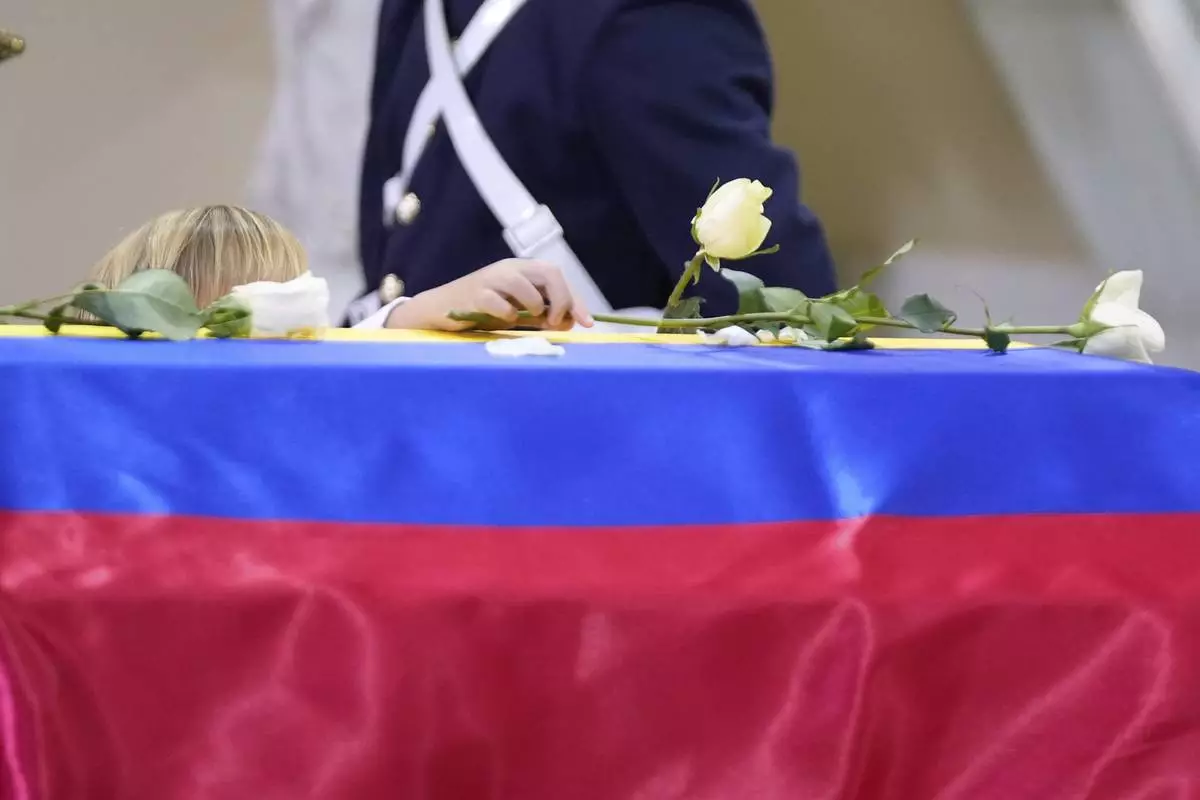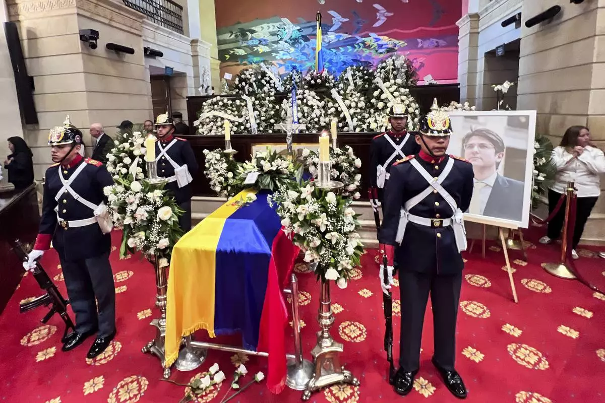 The coffin of presidential hopeful and opposition Sen. Miguel Uribe, who died from wounds suffered when he was shot at a political rally, lies in state at Congress in Bogota, Colombia, Tuesday, Aug. 12, 2025. (AP Photo/Ivan Valencia)