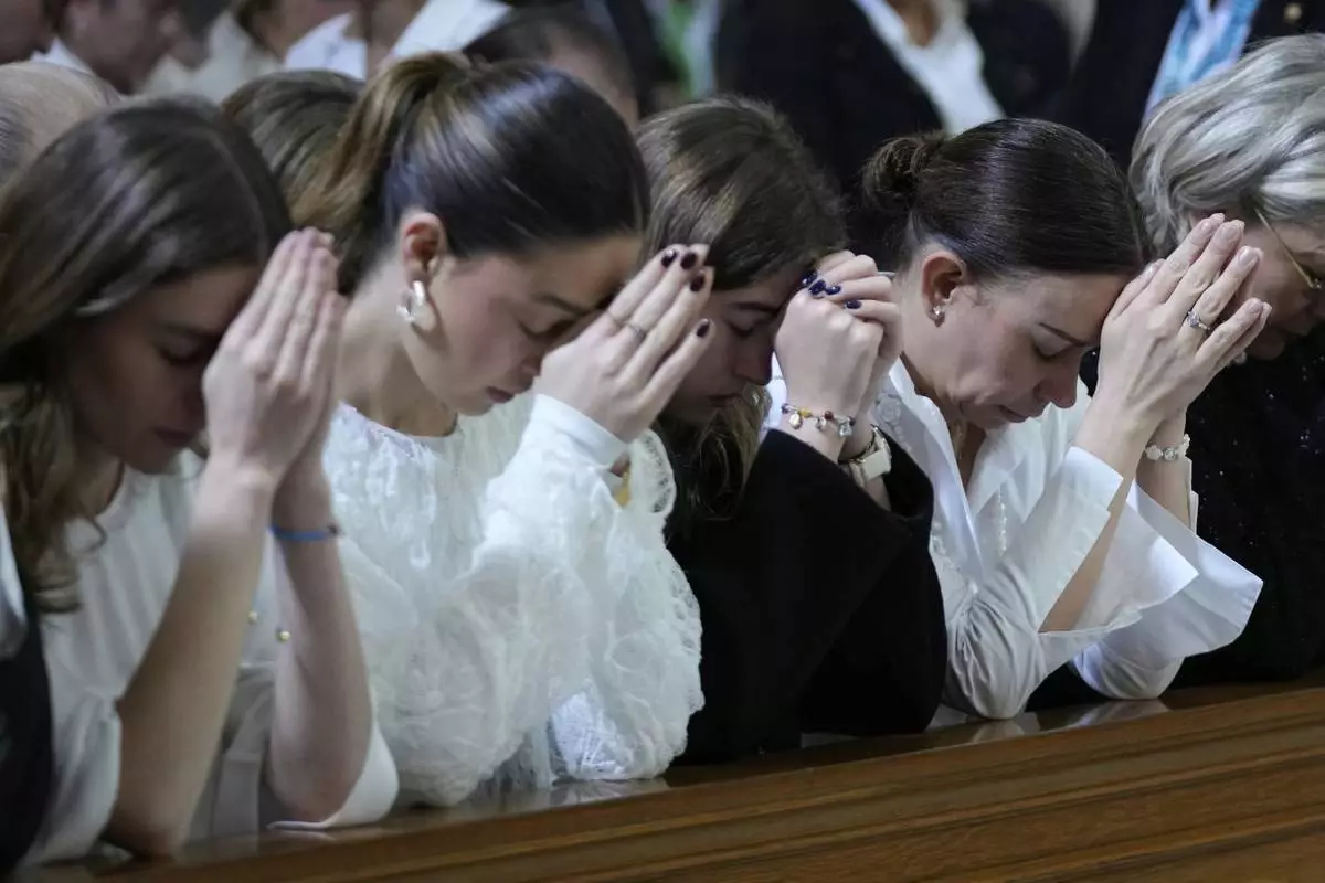CORRECTS TARAZONA'S MIDDLE NAME - Maria Claudia Tarazona, right, and her three daughters pray during the funeral service for her husband, presidential hopeful and opposition Sen. Miguel Uribe, who died from wounds suffered when he was shot at a political rally, in Bogota, Colombia, Wednesday, Aug. 13, 2025. (AP Photo/Fernando Vergara)