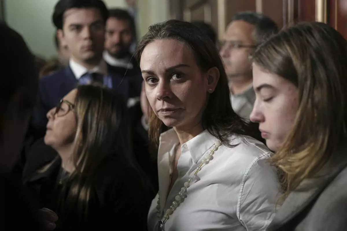 Claudia Tarazona, the wife of opposition Sen. and presidential hopeful Miguel Uribe, who died from wounds suffered when he was shot during a political rally, attends a ceremony honoring her husband, at Congress in Bogota, Colombia, Monday, Aug. 11, 2025. (AP Photo/Fernando Vergara)