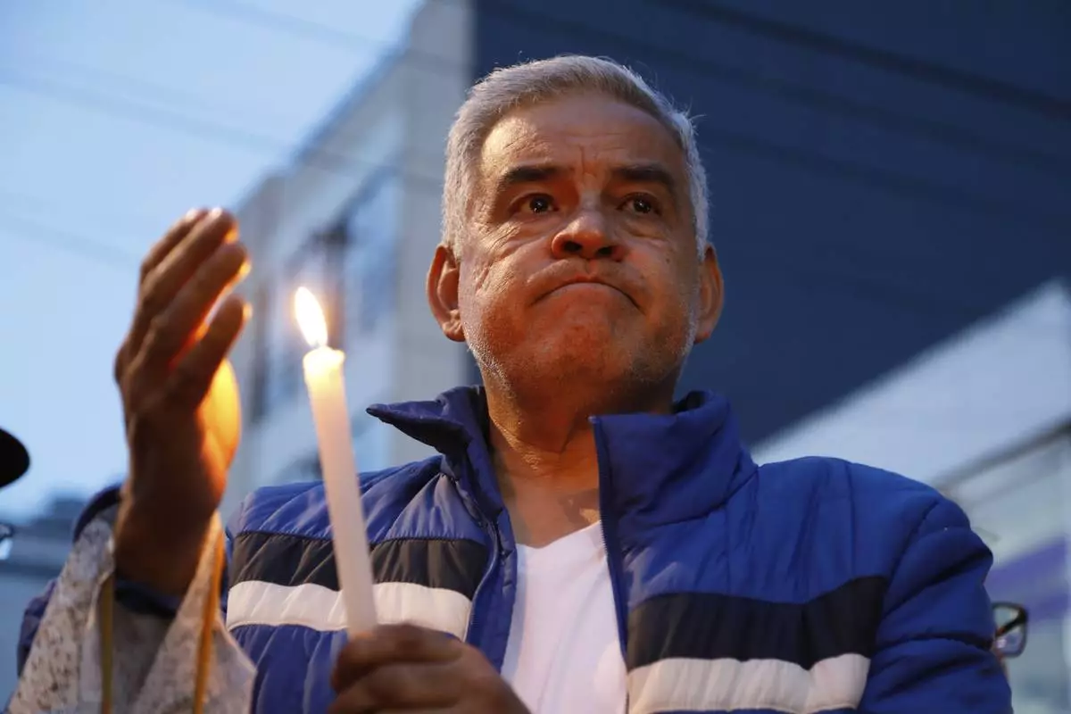 A man holds a candle during a vigil at the site where opposition Sen. and presidential hopeful Miguel Uribe was shot during a political rally, following his death, in Bogota, Colombia, Monday, Aug. 11, 2025. (AP Photo/John Wilson Vizcaino)