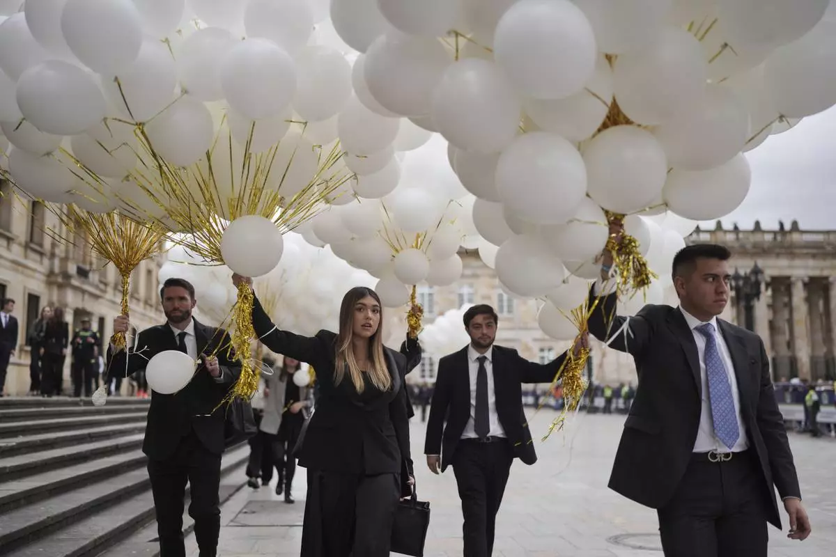 Employees of the attorney general's office release balloons during a ceremony to honor presidential hopeful and opposition Sen. Miguel Uribe, after his death more than two months after he was shot during a political rally, in Bogota, Colombia, Monday, Aug. 11, 2025. (AP Photo/Ivan Valencia)