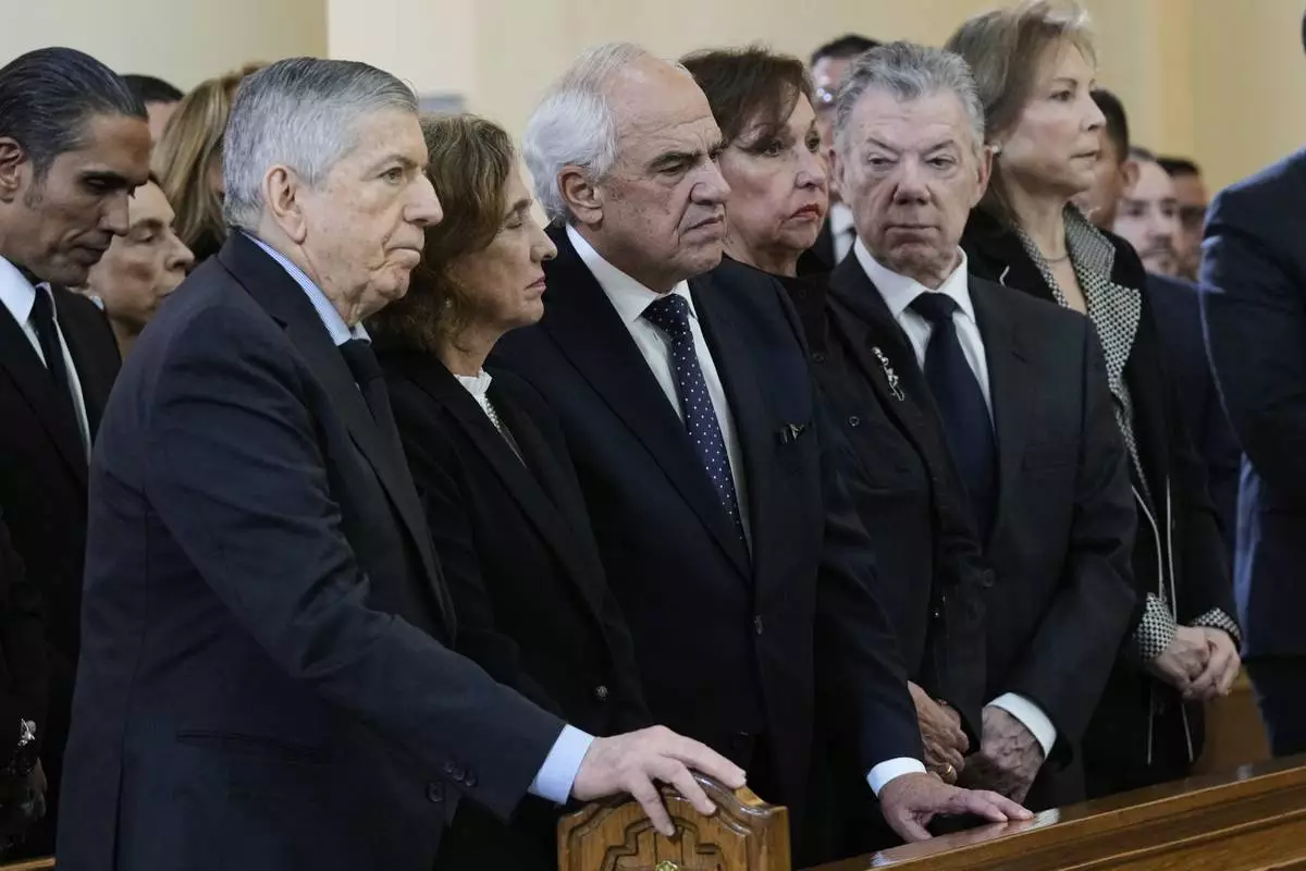 Colombia's former presidents, Cesar Gaviria, left, Ernesto Samper, and Juan Manuel Santos, right, attend the funeral mass for presidential hopeful and opposition Sen. Miguel Uribe, who died of gunshot wounds sustained at a political rally, in Bogota, Colombia, Wednesday, Aug. 13, 2025. (AP Photo/Fernando Vergara)