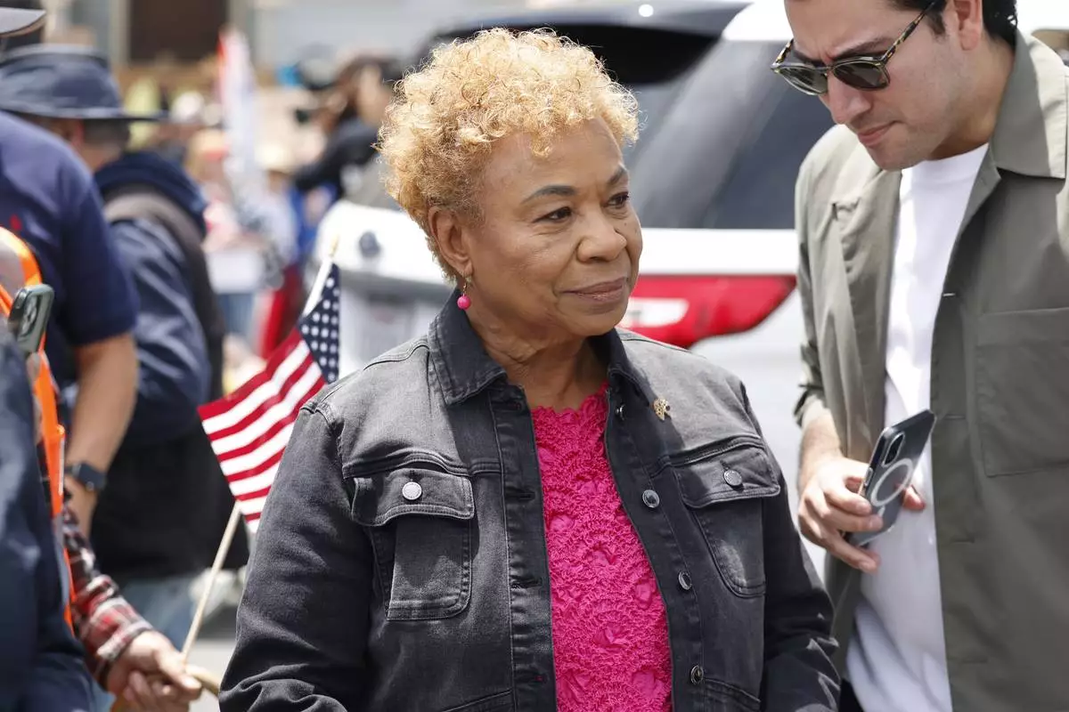 FILE - Oakland Mayor Barbara Lee speaks to the crowd at Wilma Chan Park before they march through downtown during a "No Kings" protest, June 14, 2025, in Oakland, Calif. (Jessica Christian/San Francisco Chronicle via AP, File)