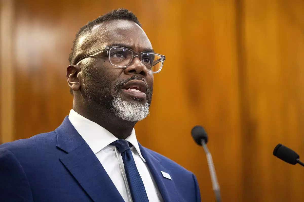 FILE - Mayor Brandon Johnson responds to an overnight shooting during a news conference at City Hall in the Loop, July 3, 2025. (Ashlee Rezin/Chicago Sun-Times via AP, File)