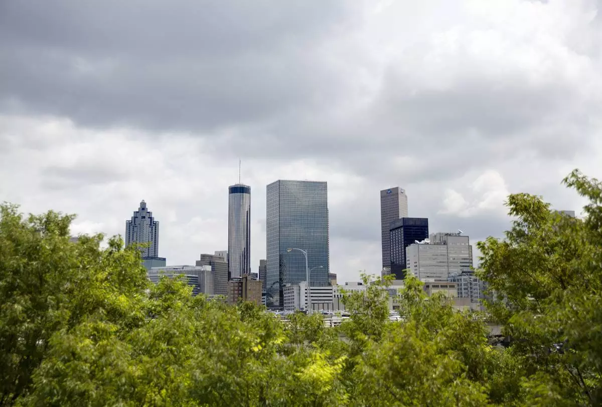 FILE - The downtown skyline rises behind a row of trees in Atlanta, June 13, 2018. (AP Photo/David Goldman, File)