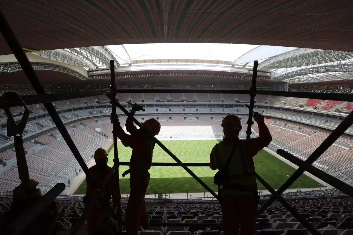 FILE - Laborers remove scaffolding at the Al Bayt stadium in Al Khor, Qatar, about 50 kilometers (30 miles) north of Doha, April 29, 2019. (AP Photo/Kamran Jebreili, File)