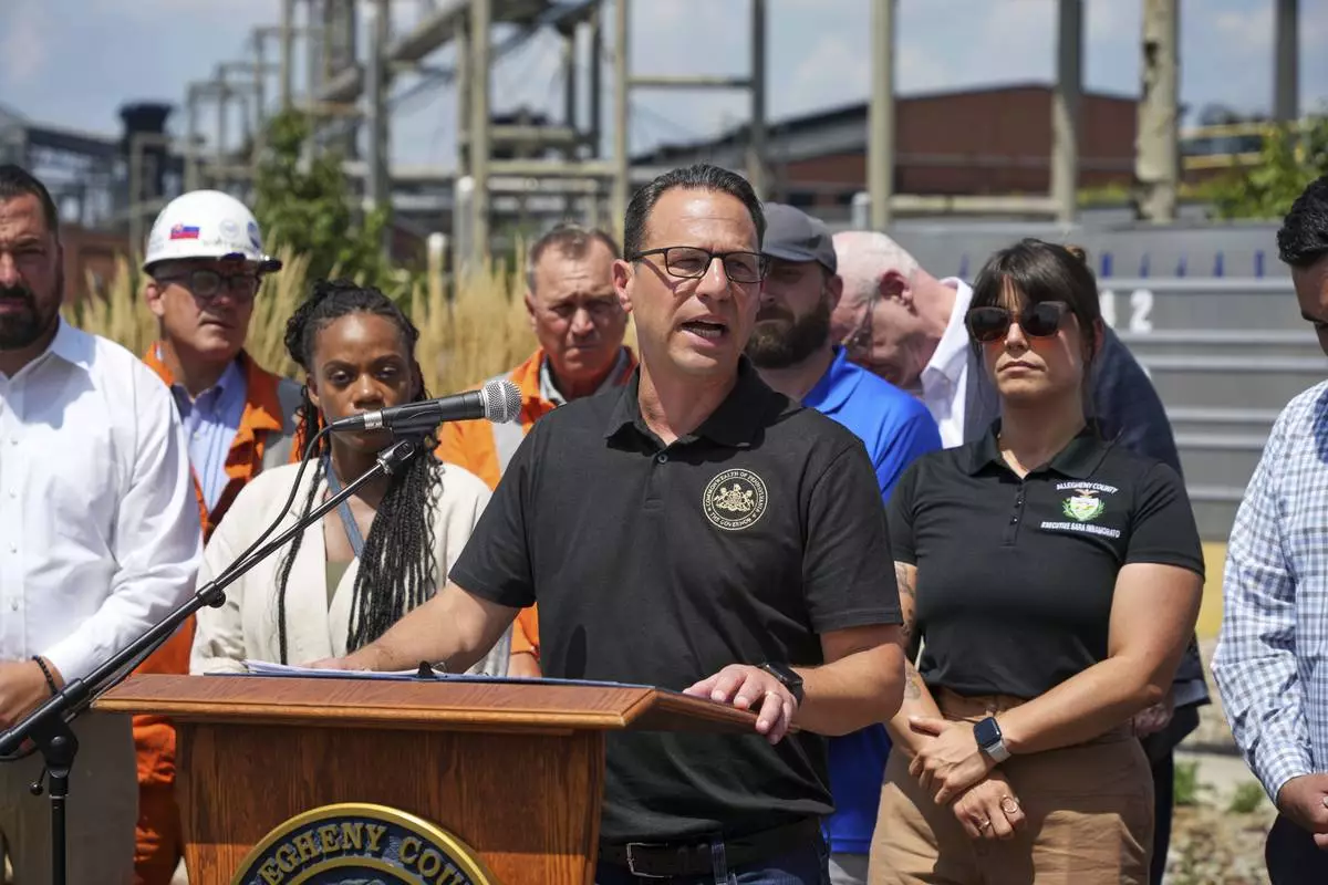 Pennsylvania Governor Josh Shapiro talks with media at the Clairton Coke Works, a U.S. Steel plant, in Clairton, Pa., Tuesday, Aug. 12, 2025. (AP Photo/Gene J. Puskar)