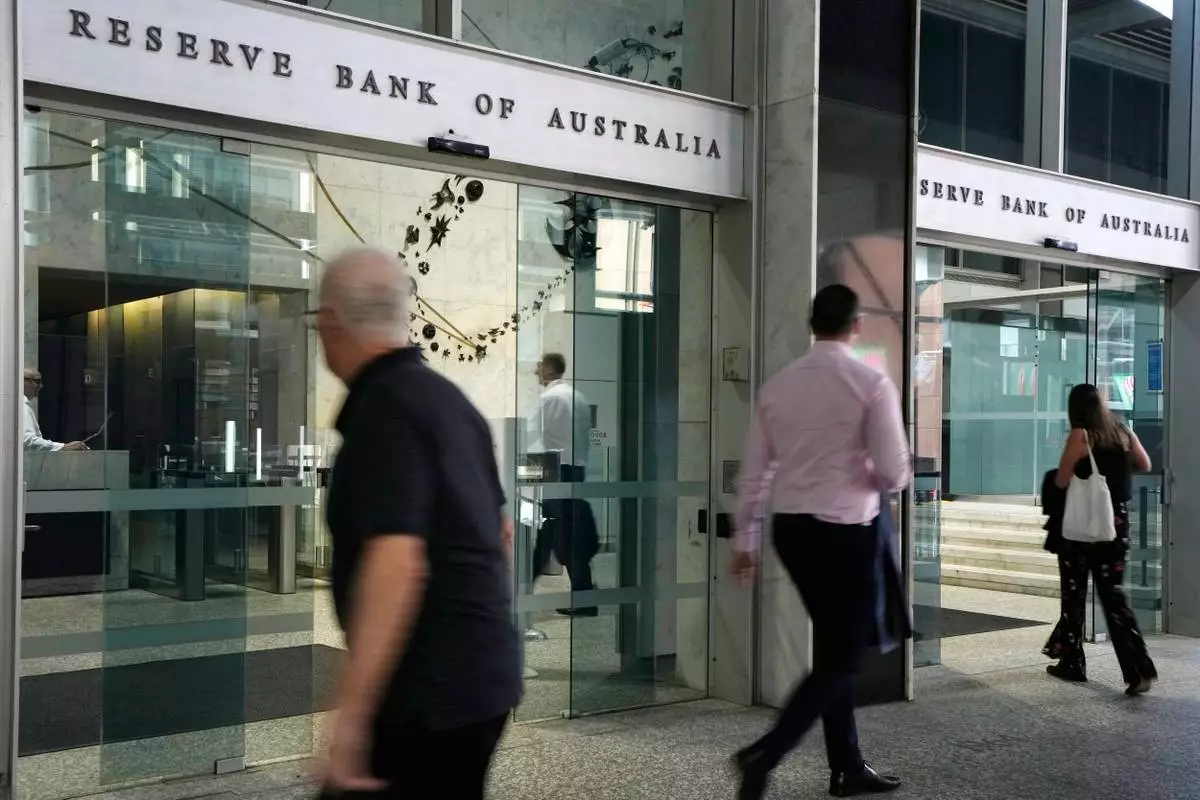 FILE - People arrive at the Reserve Bank of Australia in Sydney, Dec. 6, 2022. (AP Photo/Rick Rycroft, File)