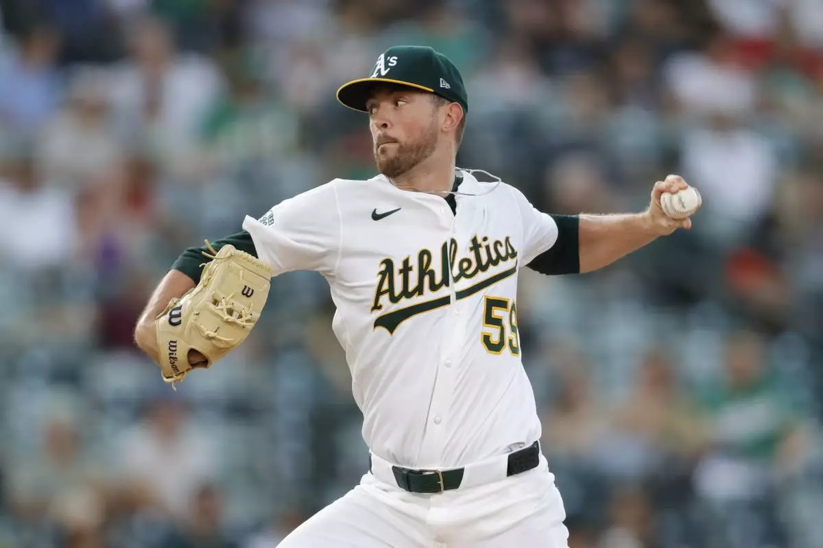 Athletics starting pitcher Jeffrey Springs throws to a Tampa Bay Rays batter during the first inning of a baseball game Monday, Aug. 11, 2025, in West Sacramento, Calif. (AP Photo/Sergio Estrada)