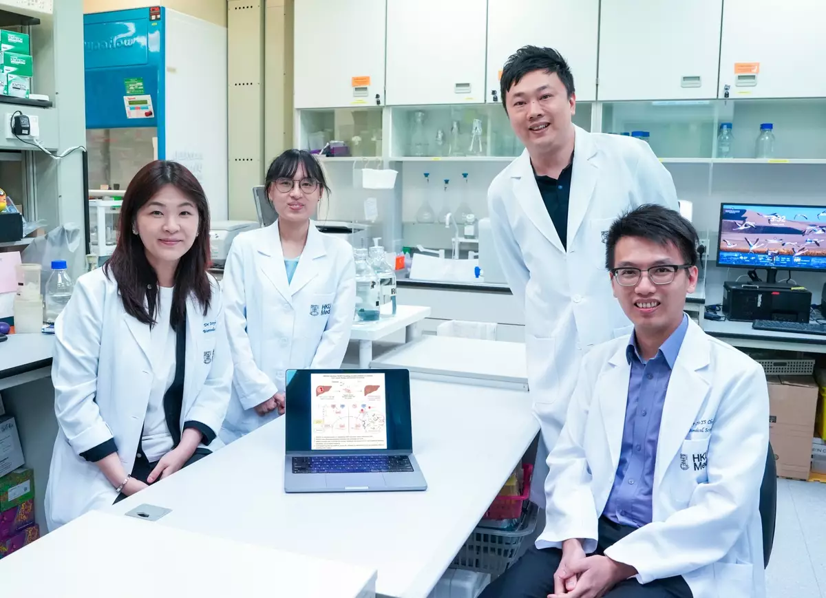 A HKUMed research co-led by Professor Stephanie Ma Kwai-yee (first left) and Professor Clive Chung Yik-sham (first right), paves the way for significant advancement in hepatocellular carcinoma (HCC) treatment by identifying a key protein that fuels tumour growth and developing an inhibitor that can improve treatment outcomes.