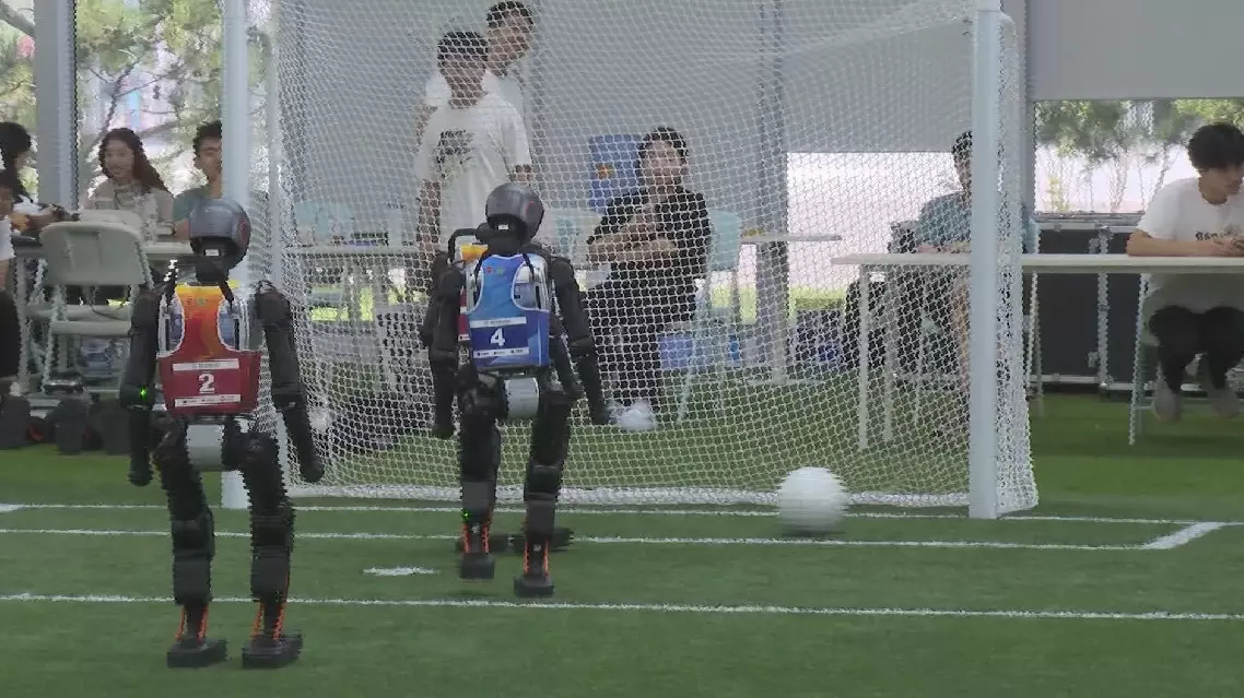 Distinguishable by their red and blue vests, these AI-powered robots orchestrated their attacks by demonstrating their dribbling skills, while they also showed off their blocking abilities in defense.