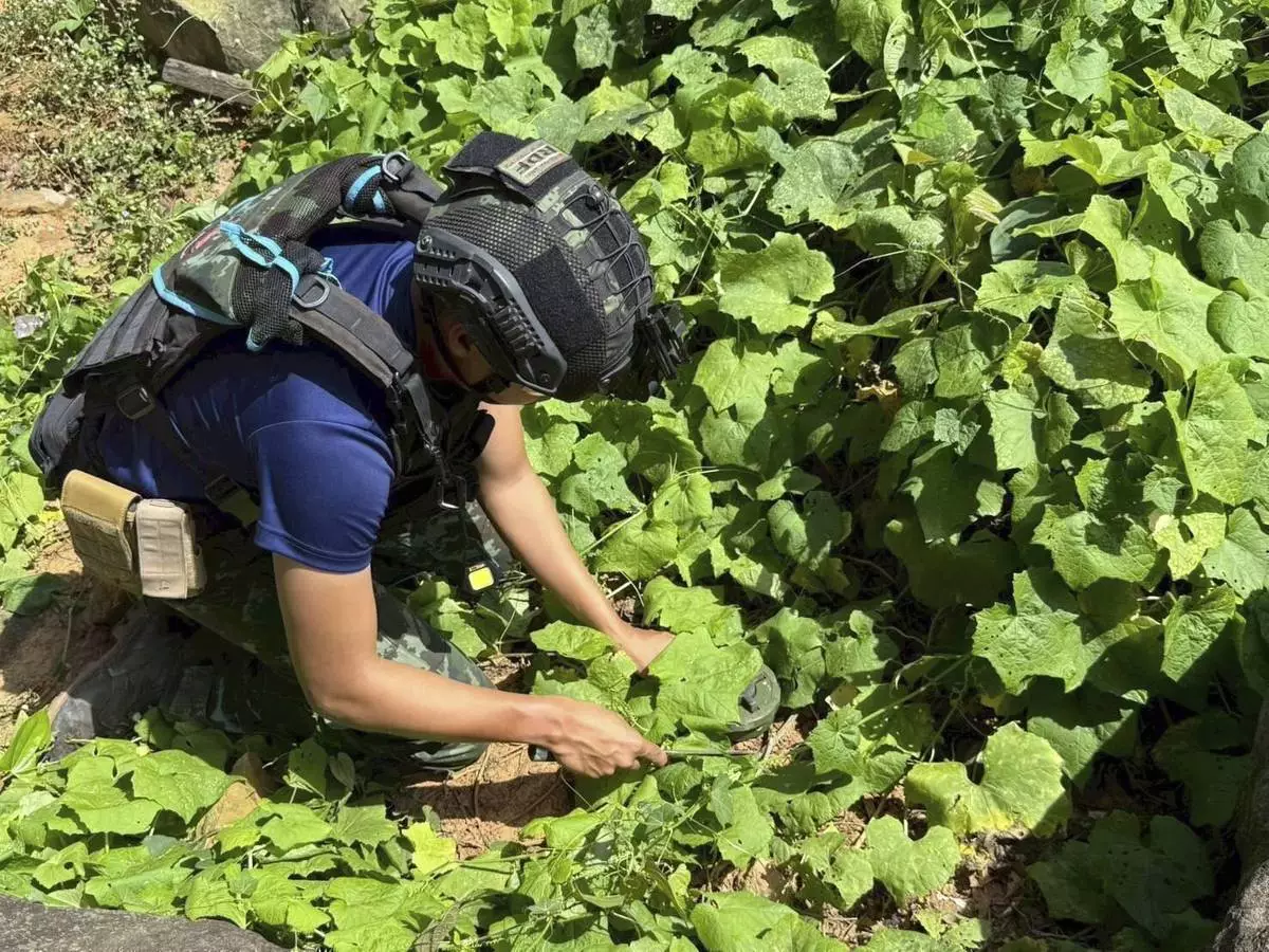 In this handout photo from the Thai Army, a Thai military engineer on Aug. 4, 2025 removes an anti-personnel mine that Thai authorities allege was planted by Cambodian soldiers in Phu Ma Kheua, a disputed area that Thailand claims is part of its Sisaket province, where the two nations recently clashed. (Thai Army via AP)