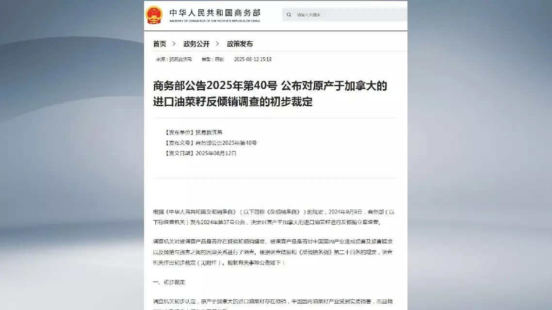 The investigation, launched on Sept. 9, 2024, examined whether the imported product, used mainly for producing rapeseed oil and meal, was being dumped and the extent of damage to China's domestic industry.