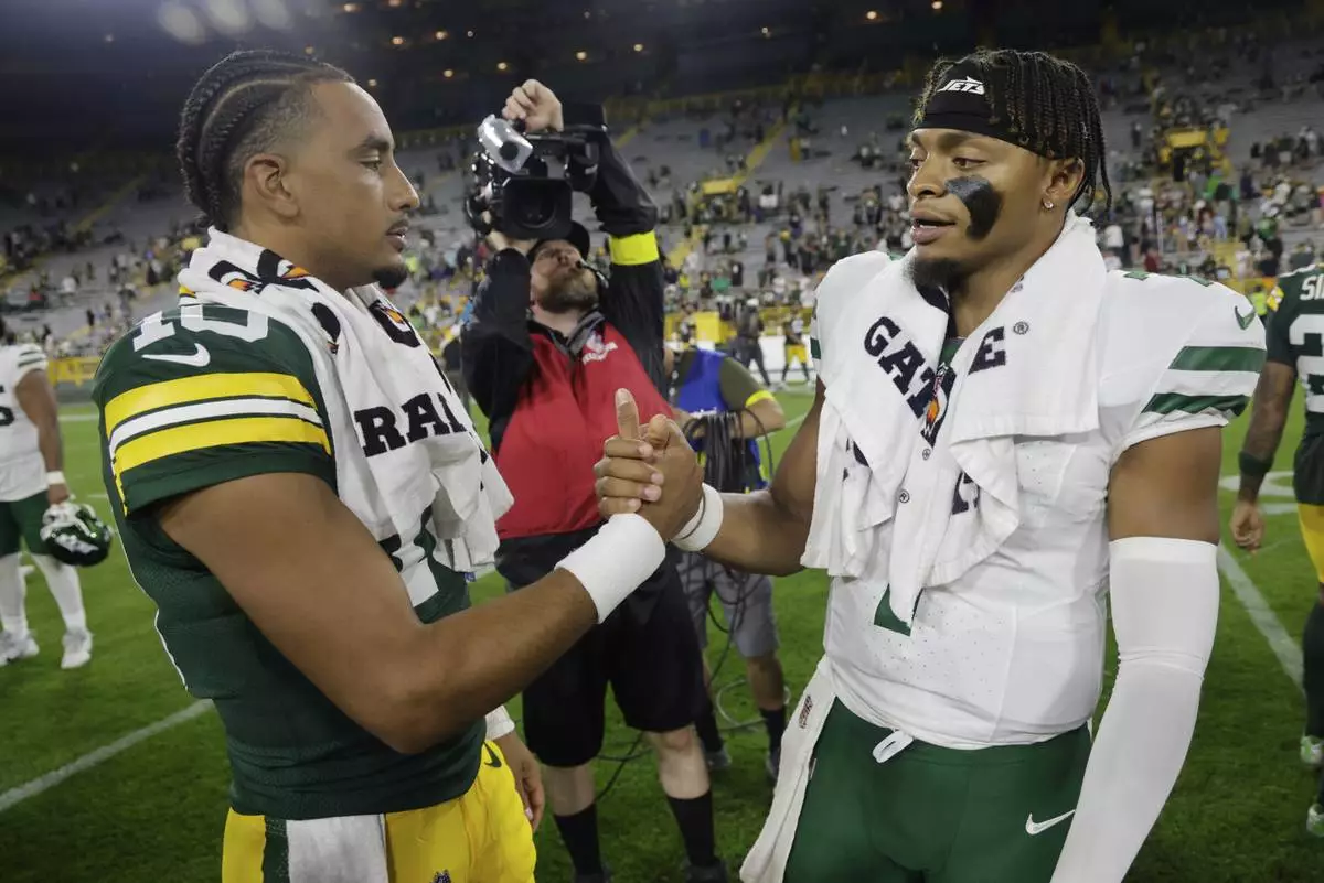 Green Bay Packers' Jordan Love talks to New York Jets' Justin Fields after a preseason NFL football game Saturday, Aug. 9, 2025, in Green Bay, Wis. (AP Photo/Mike Roemer)