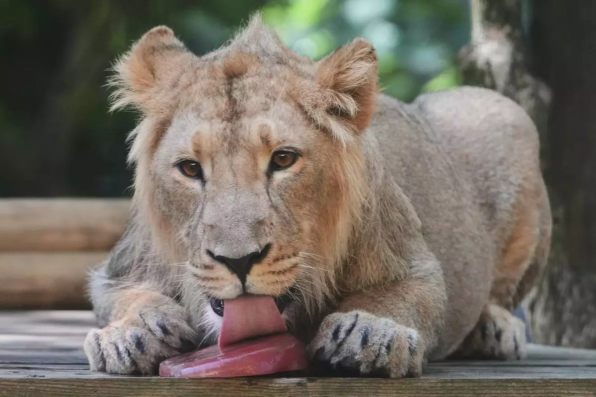 Asiatic Lion cub Mali licks a blood ice lolly at London Zoo, as parts of the UK face a fourth heatwave of the summer, with temperatures expected to rise to the mid-30s, in London, Tuesday, Aug. 12, 2025. (AP Photo/Kirsty Wigglesworth)