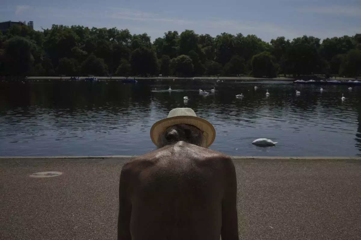 A man sits in the sun at a park in London as parts of the United Kingdom face a heat wave Monday, Aug. 11, 2025. (AP Photo/Kin Cheung)