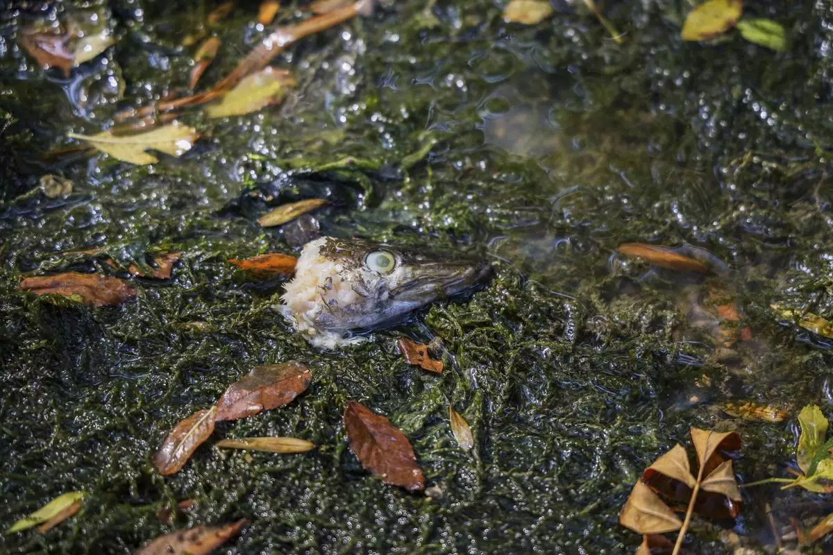The head of a dead fish lies in the almost dry Aume River bed in Saint-Fraigne, southwestern France, Thursday, Aug. 14, 2025. (AP Photo/ Yohan Bonnet)