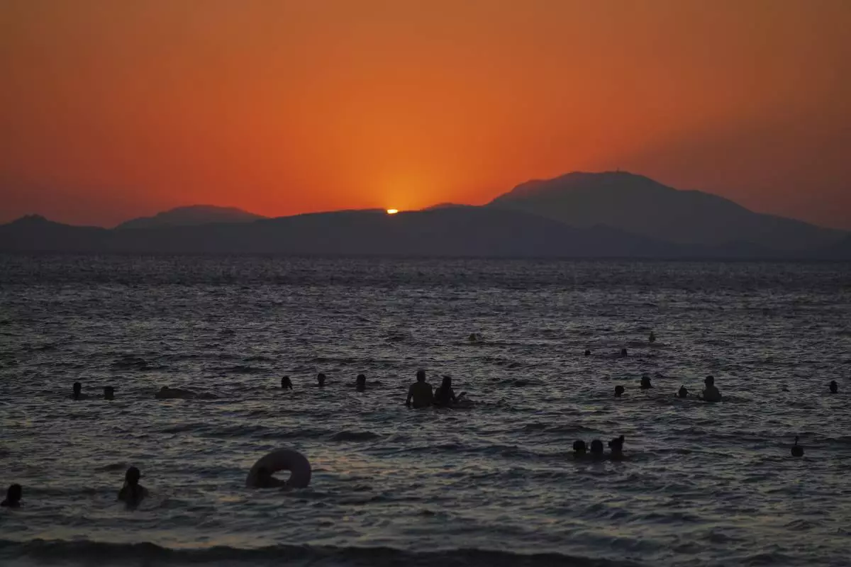 People enjoy the sea as the sun sets during a warm and windy day at Kavouri beach in southern Athens, Greece, Monday, Aug. 11, 2025. (AP Photo/Thanassis Stavrakis)
