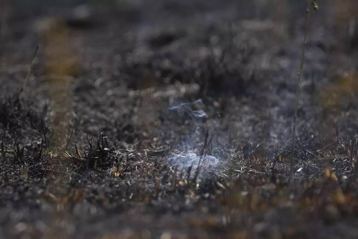 A fire smolders as members of the London Fire Brigade tackle a wildfire on Wanstead Flats in London, Tuesday, Aug. 12, 2025. (AP Photo/Joanna Chan)