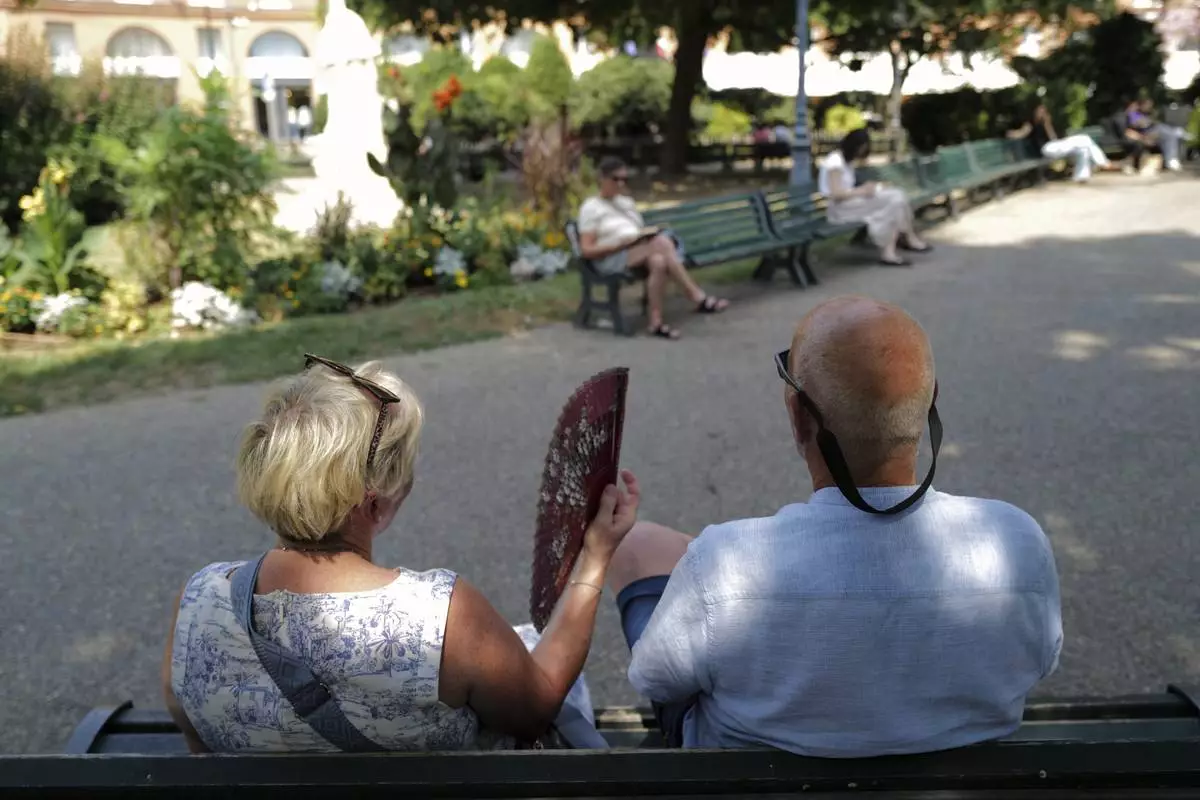 People sit on a bench in a park and use a fan Tuesday, Aug. 12, 2025 in Toulouse, southwestern France. (AP Photo/Fred Scheiber)