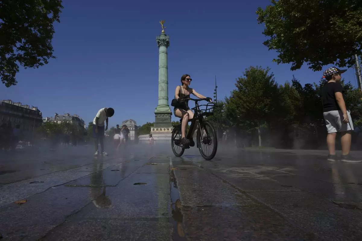 People take advantage of fresh water vapor at La Bastille square Monday, Aug. 11, 2025 in Paris. (AP Photo/Aurelien Morissard)