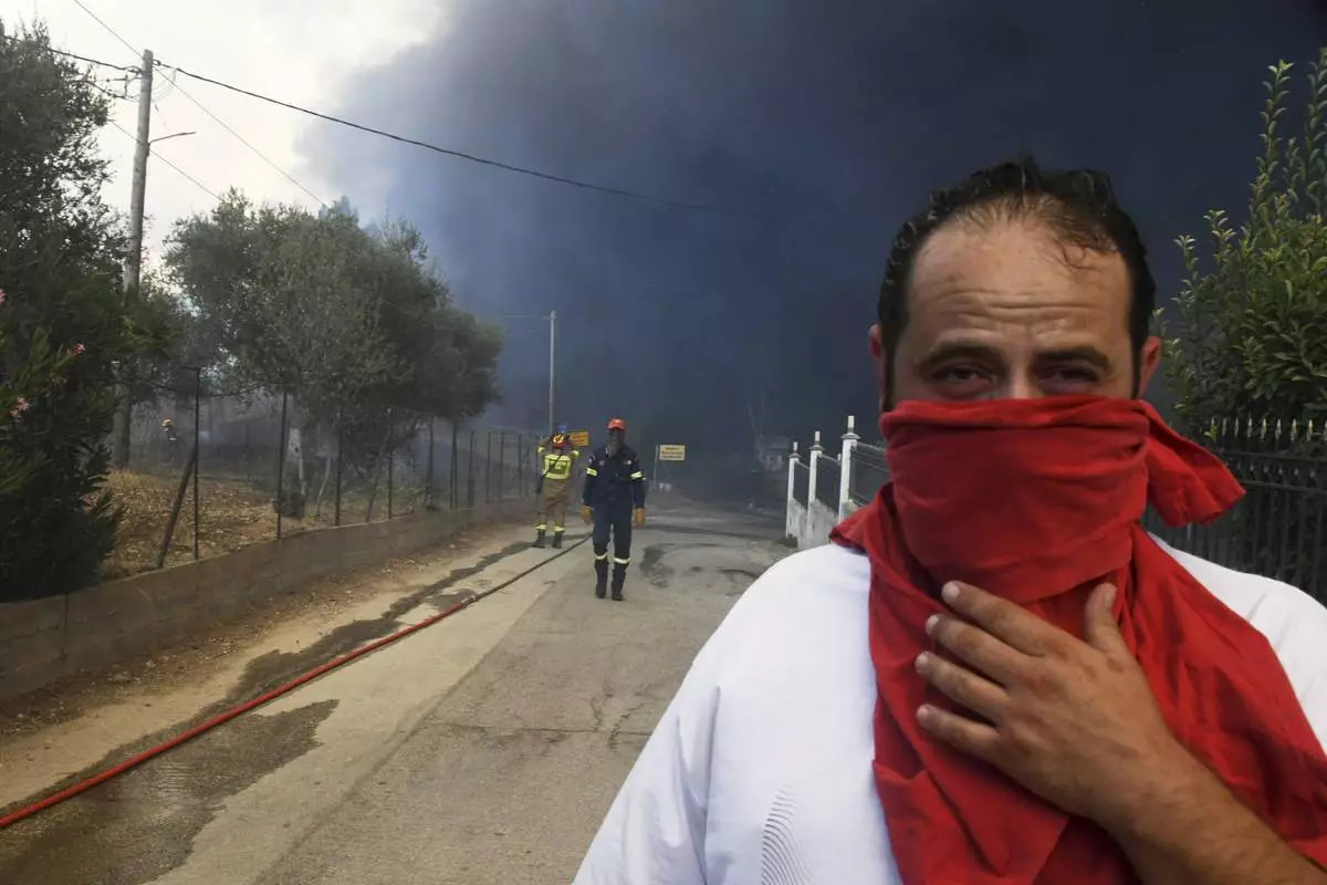 Black smoke covers the sky during a wildfire in the village of Moiraiika near Patras city, western Greece, Tuesday, Aug. 12, 2025. (AP Photo/Giannis Androutsopoulos)