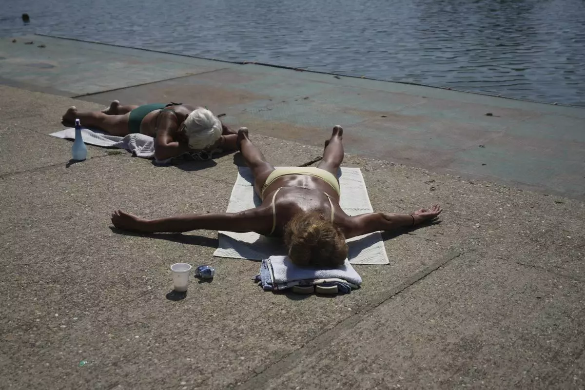 People sunbathe next to the Ada Ciganlija Lake in Belgrade, Serbia, Tuesday, Aug. 12, 2025. (AP Photo/Darko Vojinovic)