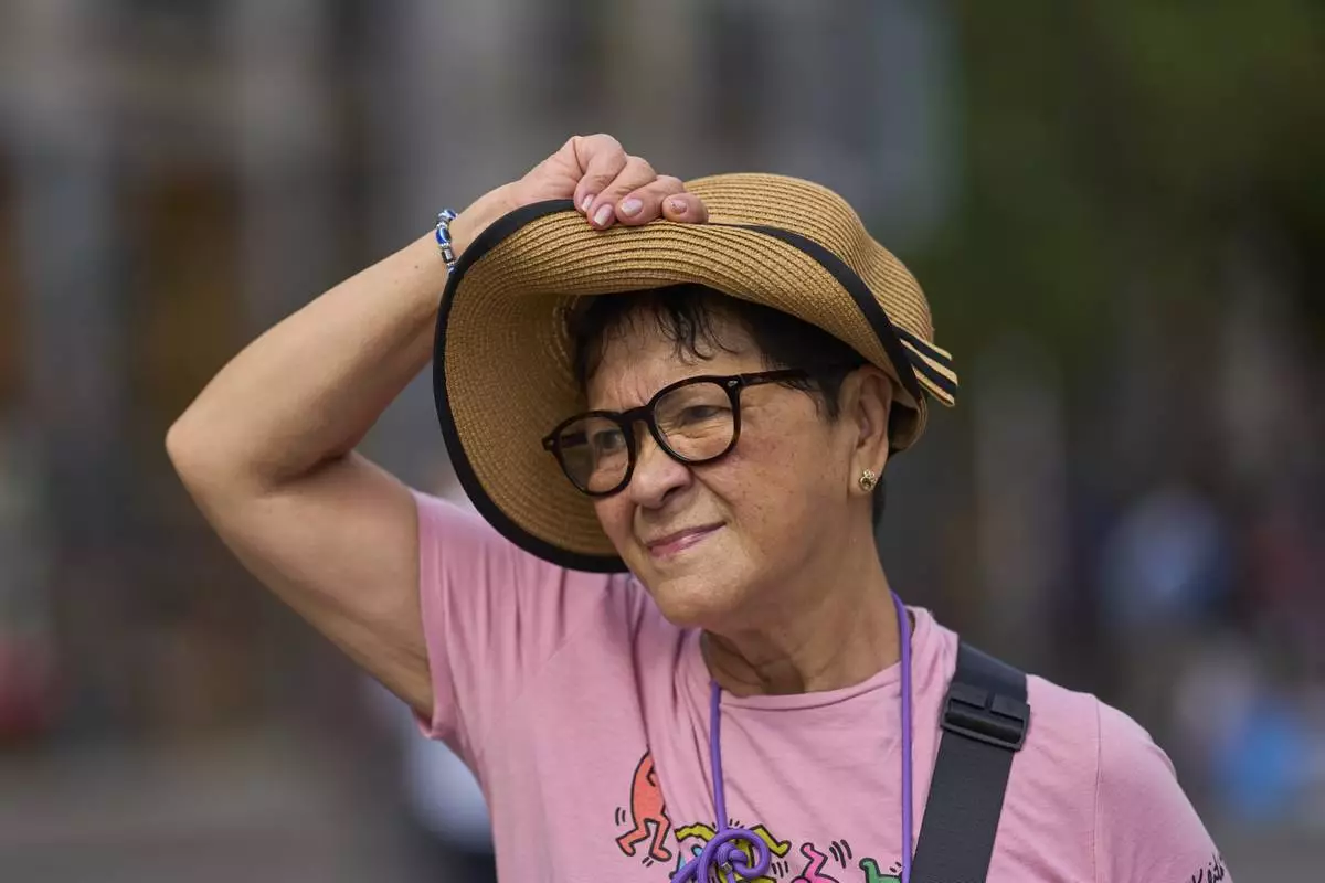 A woman protects herself with her hat during a heat wave in Madrid, Spain, Tuesday, Aug. 12, 2025. (AP Photo/Manu Fernandez)