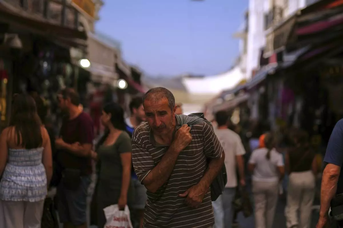 A man carries goods on his back at Eminonu district during a hot summer day in Istanbul, Turkey, Tuesday, Aug. 12, 2025. (AP Photo/Francisco Seco)