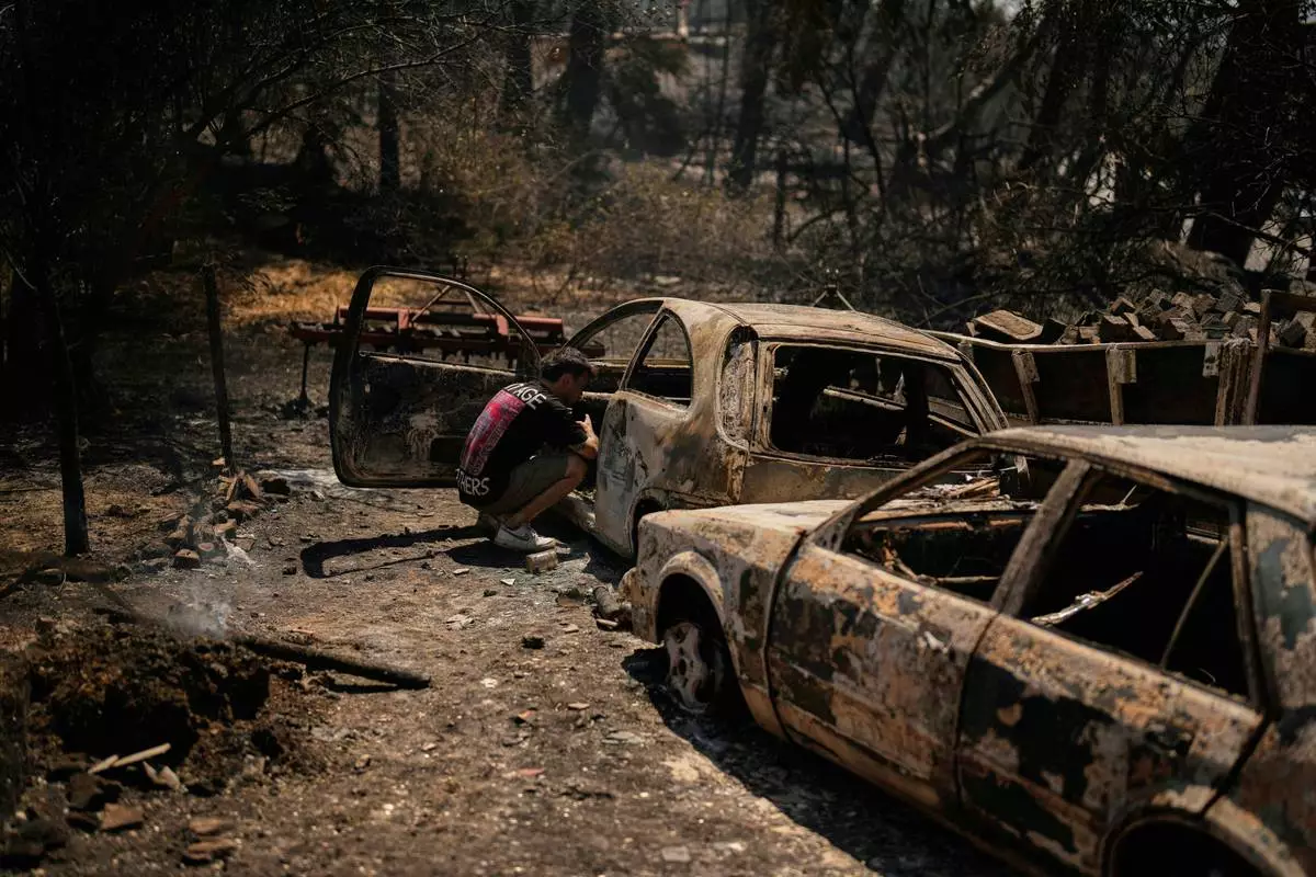 A man checks a burned car after a fire in Guzelyeli, outskirts Canakkale, northwest Turkey, Tuesday, Aug. 12, 2025. (AP Photo/Khalil Hamra)